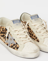 The Leopard Print & Silver Superstar Sneakers by Golden Goose combine artisan craftsmanship with cutting-edge design. Handmade in Italy, these iconic low-top lace-up sneakers feature a leopard print pony fur upper contrasted with off white leather trim. Finished with a metallic silver leather star appliqué, olive green leather heel tab and pre-scuffed rubber soles. Wear with a sultry black evening dress for an edgy and ultra-glam edit.