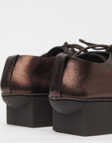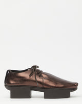 Trippen Leather Lace Up Monitor Shoes in Copper. Vegetable-tanned calf leather laminated with copper coloured foil. Light aerated rubber sole. Square toe. Branded leather insole. Lace ups. 100% Leather. Made in Germany.