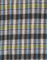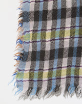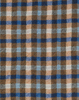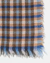 Épice Wool Scarf in Blue & Brown Check. Woven in a tight, textured, fine weave. Multi-check pattern, inspired by traditional Indian cloth. Unisex scarf. Finished with a short thin fringe. Pattern woven with dyed yarn. W 45cm x L 180cm. 100% merino wool. Made in India.