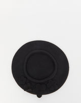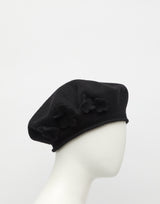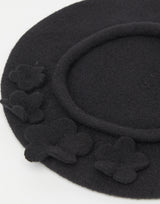 SCHA Flower Wool Beret in Black. Luxurious soft wool. Embellished with four varying sized flowers. The hat can be rolled up. One size. 100% wool. Handmade in Germany.