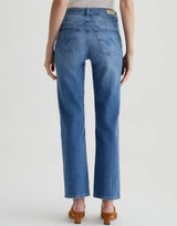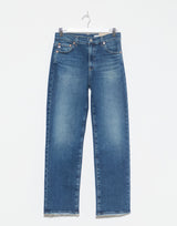 Adriano Goldschmied Brinley Mid Rise Jeans in Iris. Mid-rise straight silhouette. Made from Italian vintage comfort stretch denim. Five pocket design. Sits right at the natural waist and fall to a classic straight-leg silhouette. Medium blue wash with fading, whiskering, and worn edges. 98% cotton 2% elastane. Made in Mexico.