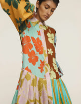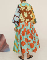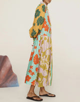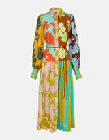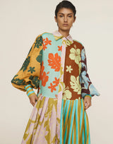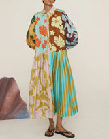 Alémais Ramie Poppy Spliced Shirt Dress. Made from lightweight ramie. Relaxed shirt dress silhouette. Point collar and stand. Balloon sleeves with button cuff. Concealed placket with self-covered buttons. Self-rouleau belt with toggle ends. Slip included. Pleated skirt. 100% ramie.