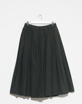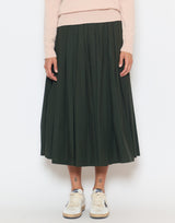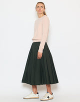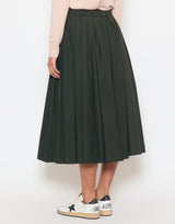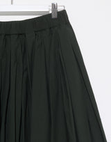 Apuntob Cotton Polyamide Pleated Skirt in Forest. Mid to heavyweight canvas feel pleated skirt. Mid Length. Elasticated waistband. Gentle pleats. Two side seam pockets. Unlined. Regular fit. 50% cotton, 50% polyamide. Made in Italy.