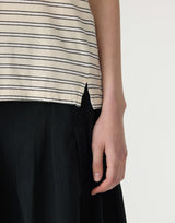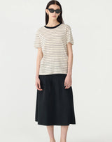 Bassike Cotton Regular T-Shirt in Black & Ecru Stripe. The Stripe Regular Short Sleeve T-Shirt is a classic silhouette redefined in an organic single jersey stripe, knitted in Australia. Designed for a regular fit, this everyday staple features a contrast ribbed neckline and split hem detailing. Regular fit. 100% organic cotton. Made in Australia.