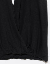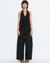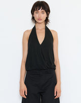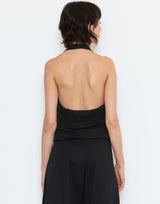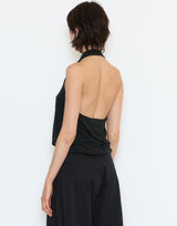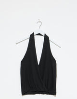 Deiji Studios Linen Blend Halter Top in Black. Made from a OEKO-TEX 100 French linen and lyocell blend. Halter top with soft wrap over with elasticated bubble-hem. V neckline. Low back. Relaxed fit. 55% linen 45% lyocell.