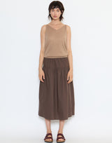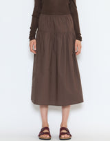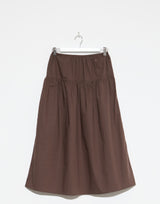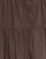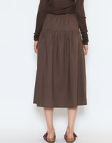 Deiji Studios Cotton Button Skirt in Chocolate Brown. Made from soft lightweight 100% GOTS certified organic cotton. Mid-length. Elasticated waistband for comfortable fit. Front fixed button feature. Dropped skirt with gathered detailing. Relaxed fit. 100% cotton.
