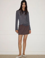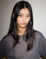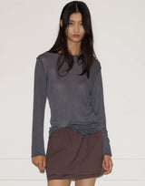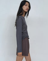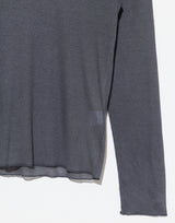 Deiji Studios Viscose Blend Long Sleeve Knit Top in Steel Grey. Made from a sheer lightweight ecovero viscose blend with OEKO-TEX certification. Long sleeve top with exposed seams and tag. Baby lock finishes. Round neckline. Relaxed fit. 65% ecovero viscose 35% recycled polyester.