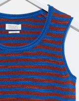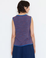 Toast Linen & Cotton Knit Vest in Bluebird & Brick Stripe. Made from lightweight slub linen and cotton. Contrast stripe. Round neckline. Rolled trim at neck and hem. Can be worn alone or layered. Regular fit. 52% linen 48% cotton.
