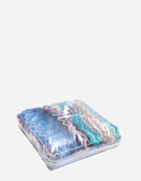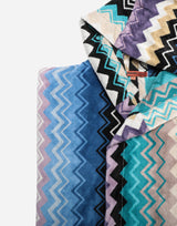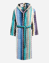 Missoni Home Giacomo Cotton Hooded Bathrobe. Iconic zig zag pattern in various shades of blue. Plush cotton velour on the outside and terry toweling on the inside for increased absorbency making it equal parts comfortable and luxurious. Generous sized hood. Matching self-tie belt. Two front patch pockets. Unisex. Hook loop. 100% cotton. Made in Portugal.
