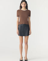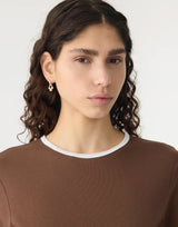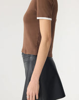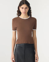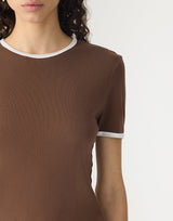 Bassike Rib Contrast T-Shirt in Brown & White. Crafted from organic cotton superfine rib knitted in Australia. Designed for a slim fit with a slightly cropped silhouette. This signature style features contrast rib binding at the neckline and sleeve hems and is finished with Bassike’s contrast chainstitch detail at the back neck. Slim cropped fit. 100% organic cotton. Made in Australia.