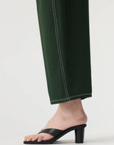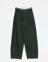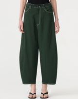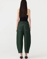 Bassike Cotton Twill Barrel Leg Pants in Pine Green. Cut in a relaxed barrel silhouette with a mid-rise waist. Featuring a classic jean-style front fastening, curved side entry pockets and rear patch pockets, finished with contrast topstitching throughout. Crafted from Italian raised cotton twill for structure and durability with a soft hand feel. Regular fit. 100% cotton. Made in Australia.