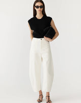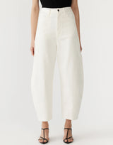 Bassike White Cotton Twill Barrel Leg Pants. Crafted in premium Italian cotton twill. Designed for an voluminous, tapered fit. A contemporary take on the traditionally slouchy pant, this high-rise style features a curved silhouette throughout the leg. Complete with a classic jean style front fastening, side entry pockets and rear patch pockets. Relaxed fit. 97% organic cotton 3% elastane. Made in Australia.