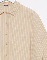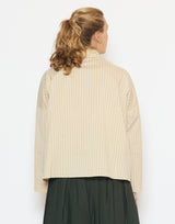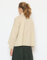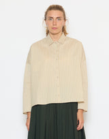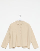 Apuntob Cotton Silk Blend Shirt in Natural. Lightweight cotton silk blend, with strips for an elevated look. Full length sleeves. Drop shoulder. Classic collar. Front patch pocket right breast. Tonal buttons. Unlined. Boxy fit. 80% cotton, 20% silk. Made in Italy.