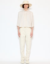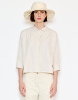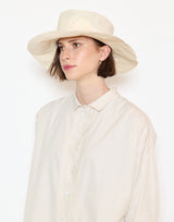 SCHA Waxed Cotton Walk Time Short Hat in Ecru. Structured waxed cotton. Water repellent with soft cotton sweatband. Raw edges. 100% cotton. Made in Germany.