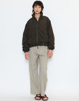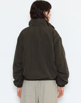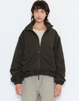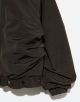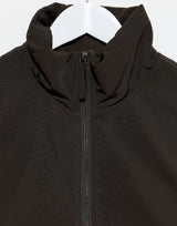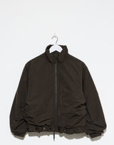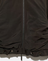 Deiji Studios Press Stud Jacket in Dark Chocolate. Padded jacket with sculptural volume and soft structure, featuring a reshaped collar, elasticated cuffs and hem, functional press stud belt detail and a full-length zip. Designed with fanned pinch detailing and internal zip pocket. 100% recycled polyester outer and filling, 100% organic cotton lining.