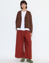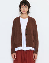 Toast Wool & Cashmere Cardigan in Pecan Brown. Soft wool and cashmere blend. V neckline. Long sleeves. Button front with Corozo buttons. Knitted to a boxy, loose-fitting shape. Dropped shoulders. Patch pockets. Integral ribbed sleeves and hem. Relaxed mid hip fit. 70% wool, 30% cashmere.
