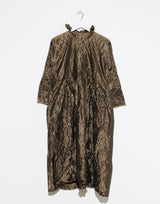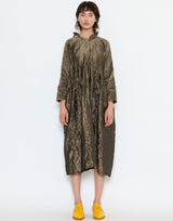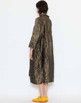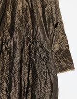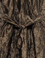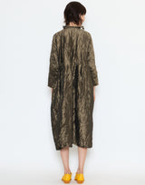 Daniela Gregis Silk Operaio Bianco Lavato Dress in Bronze. Meticulously handmade from prewashed silk to create a unique textural and colour effect. Long sleeves with raw hem. Round neckline with button closure. Stand up collar with raw edging. Can be worn front or back. Pleat detail at waist. Side pockets. Self-tie belt. Relaxed fit. 100% silk. Handmade in Italy.