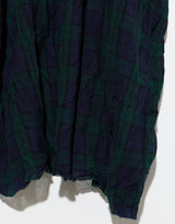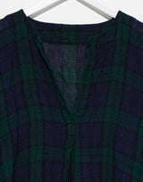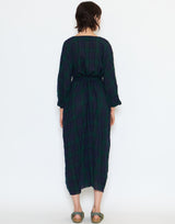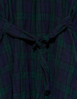 Daniela Gregis Wool Bianco Lavato Dress in Navy & Green Tartan. Meticulously handmade from lightweight wool, which has been pre washed for added softness and a unique texture. Long sleeves. V neckline. Side seam pockets. Slight balloon silhouette. Can be worn front or back. Self-tie belt to style may different ways. Frayed hemline. Relaxed fit. 100% wool. Handmade in Italy.