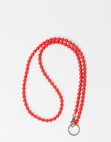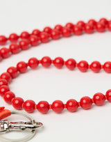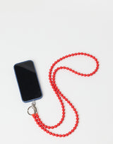 Ina Seifart Phone Necklace in Red. Handmade in Germany from certified sustainable (FSC) wooden beads which have been uniquely coloured with non-toxic varnish. Elastic band and threaded beads. Metal ring and clasp. Bead Ø 1cm Chain L 120cm. Handmade in Germany.