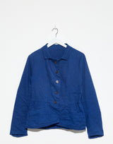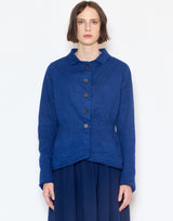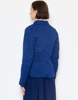 Hannoh Wessel Cotton Blend Jerry Jacket in Blue. Made from cotton, metallic fibres and elastane which offers a natural sheen. Prewashed for added softness and texture. Lapel collar. Button front closure. Front pockets. Fully lined. Inner adjustable waistband to accentuate the silhouette. 85% cotton 11% metallic fibres 4% elastane. Made in Italy.