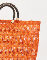 Jungle Direct Oval Net Basket Bag in Orange. Handmade from Elephant grass, which is harvested from the Fra Fra people of Northern Ghana, soaked, and stretched to produce a fine supple, and extra strong fibre which is hand woven into these incredible basket bags. Featuring an oval shape, leather braided top handles these bags are hand made by skilled weavers; therefore, no two bags are ever the same. W 55cm x H 40cm x D 24cm. Handle drop approx. 20cm. Handmade in Ghana.