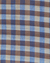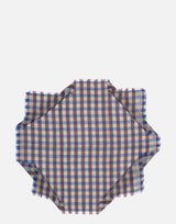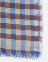 Épice Wool Square Bandana in Blue & Brown Check pattern. Made from soft lightweight wool. Finished with a short thin fringe. Unisex. W 70cm x L 70cm. 100% wool. Made in India.