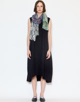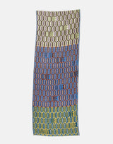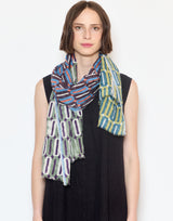 Épice Paris Herbay Linen & Cotton Scarf. Narrow hand woven stole. Soft, lightweight weave in a fine blend of cotton and subtly textured linen. Hand screen printed. Custom pattern created using antique wood letter blocks. Colourful panels overlap in a playful interplay of colours. Elegant jacquard border. Pin fringe edges. W 60cm x L 180cm. 60% linen 40% cotton. Made in India.
