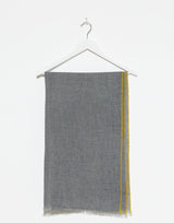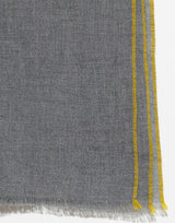 Oyuna Cashmere Contrast Shawl in Grey. Knitted from the finest Mongolian cashmere. Meticulously handmade in a lightweight stitch. Contrast yellow edge. Luxuriously large, perfect for layering, and wrapping. Lightly frayed ends. L 200cm x W 70cm. 100% Cashmere. Made in Mongolia.
