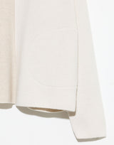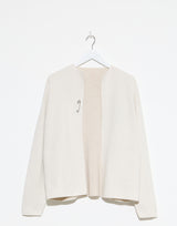 Oyuna Cashmere Reversible Loro Jacket in Ivory Feather. Knitted from the finest Mongolian cashmere. Meticulously handmade in a double face fine stitch. Reversible with Ivory one side and feather on the reverse. Long sleeves. Round neckline. Front circular pockets. Includes with a pin to close. Relaxed fit. 100% Cashmere. Made in Mongolia.