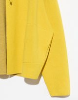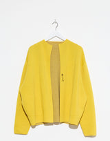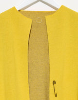 Oyuna Cashmere Reversible Loro Jacket in Lemon Taupe. Knitted from the finest Mongolian cashmere. Meticulously handmade in a double face fine stitch. Reversible with lemon yellow one side and taupe on the reverse. Long sleeves. Round neckline. Front circular pockets. Includes with a pin to close. Relaxed fit. 100% Cashmere. Made in Mongolia.