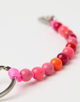 Ina Seifart Perlen Short Key Chain in Pinkmix. Handmade in Germany from certified sustainable (FSC) wooden beads which have been uniquely coloured with non-toxic varnish. Elastic band and threaded beads. Metal ring and clasp. Bead Ø 1cm Chain L 22cm. Handmade in Germany.