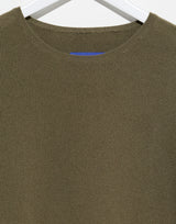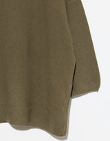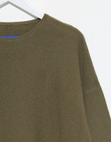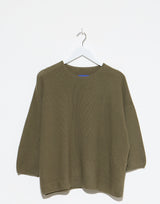 Oyuna Cashmere Gabi Pullover in Moss. Knitted from the finest Mongolian cashmere. Meticulously handmade in a lightweight and textured stitch. Three-quarter length sleeves. Round neckline. Side seam splits. Relaxed, boxy fit. One size. 100% Cashmere. Made in Mongolia.