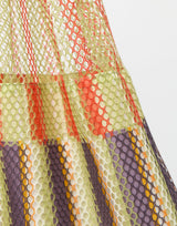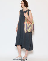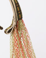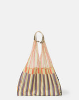Épice Paris Large Triangle Elziver Bag in Sprout. Made from a printed polyester mesh fabric. Sunny summer vibes with these bold colourful stripes. Woven handles. Removable inner zipper pouch. Stylish, lightweight and versatile bag for everyday use, carried on the shoulder or in hand. Partially lined. H 50cm x W 47cm x D 12cm. Made in India.