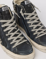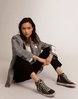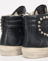 The Black Leather and Studs Slide Sneakers by Golden Goose are artfully distressed by hand, so they look authentically worn-in. Made in Italy these high-tops feature contrasting silver stud detailing for a dose of grunge. Finished with light grey laces, side zip to easily slip on and off and iconic branding. Team yours with vintage jeans for fuss-free styling.