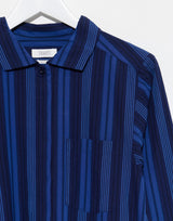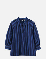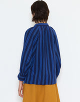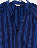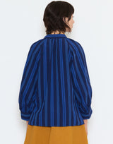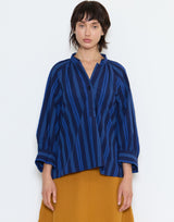 Toast Cotton Catrin Shirt in Royal Blue Stripe. Crafted from organic cotton. Featured wide graphic alternating stripes. Gathers at neck and cuffs. V neckline with single corozo button. Band collar. Bracelet length raglan sleeves with button cuffs. Side hem slits. Low hip length. Relaxed, easy fit. 100% cotton.