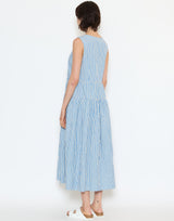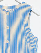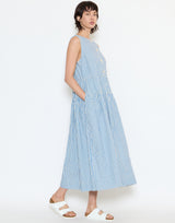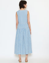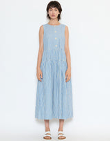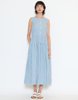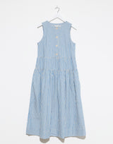 Toast Stripe Cotton Dress in Blue & Ecru Candy Stripe. Made from a organic cotton. Fine candy stripe. Gathered detailing and knife pleats below the waist to create volume in the skirt. Sleeveless. Round neckline. Partial button-down front with Corozo buttons. Regular fit. 100% cotton.